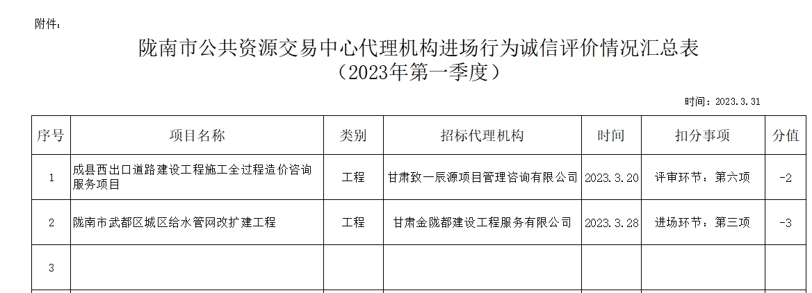 根據(jù)《甘肅省公共資源交易代理機(jī)構(gòu)管理辦法》(甘政辦發(fā)〔2019〕107號)和《隴南市公共資源交易中心代理機(jī)構(gòu)進(jìn)場行為誠信評價(jià)實(shí)施制度(試行)》規(guī)定,現(xiàn)對2023年第一季度,共2家代理機(jī)構(gòu)2條進(jìn)場行為誠信評價(jià)記錄予以通報(bào)(詳見附表)。請各代理機(jī)構(gòu)嚴(yán)格遵守各項(xiàng)規(guī)章制度、誠實(shí)守信,規(guī)范操作,為招標(biāo)人和采購人提供專業(yè)、高效、規(guī)范的招標(biāo)代理服務(wù)。
