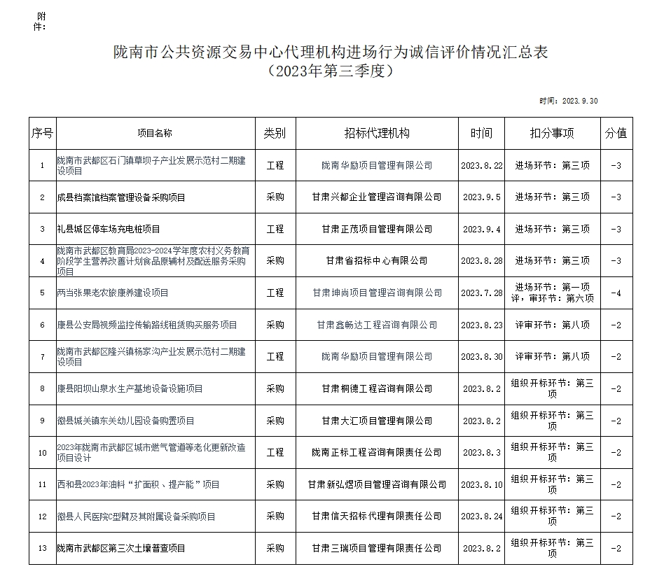 根據(jù)《甘肅省公共資源交易代理機(jī)構(gòu)管理辦法》(甘政辦發(fā)〔2019〕107號(hào))和《隴南市公共資源交易中心代理機(jī)構(gòu)進(jìn)場行為誠信評(píng)價(jià)實(shí)施制度(試行)》規(guī)定,現(xiàn)對(duì)2023年第三季度,共 12 家代理機(jī)構(gòu) 13 條進(jìn)場行為誠信評(píng)價(jià)記錄予以通報(bào)(詳見附表)。請(qǐng)各代理機(jī)構(gòu)嚴(yán)格遵守各項(xiàng)規(guī)章制度、誠實(shí)守信,規(guī)范操作,為招標(biāo)人和采購人提供專業(yè)、高效、規(guī)范的招標(biāo)代理服務(wù)。