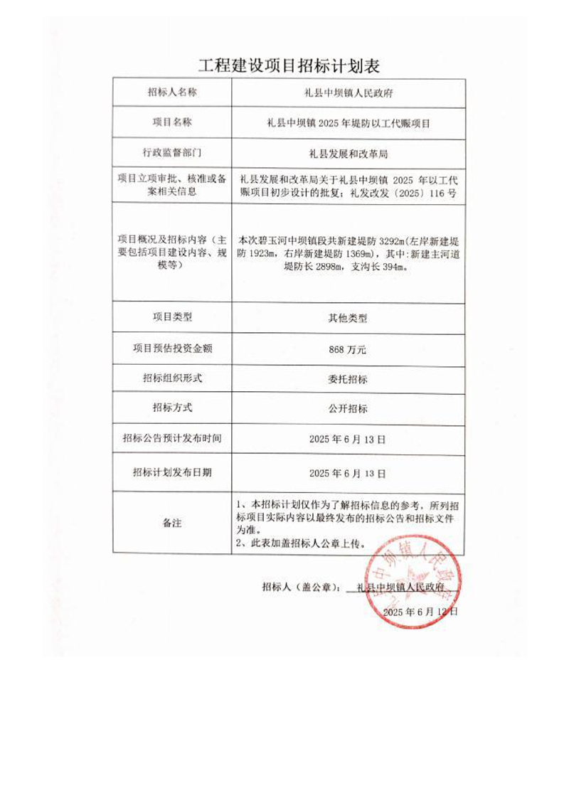 禮縣中壩鎮(zhèn)2025年堤防以工代賑項(xiàng)目