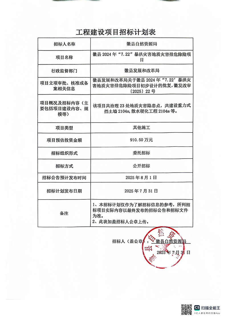 徽縣2024年“7.22”暴洪災害地質(zhì)災害排危除險項目