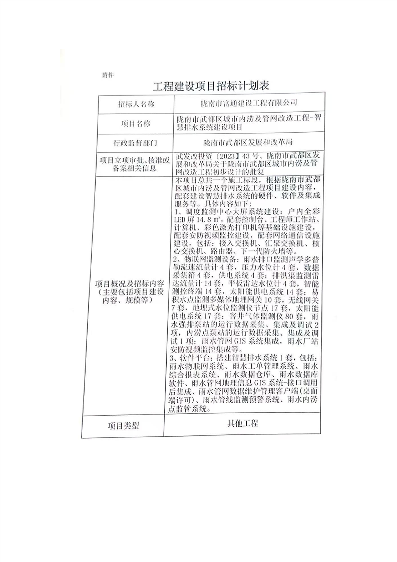 隴南市武都區(qū)城市內(nèi)澇及管網(wǎng)改造工程-智慧排水系統(tǒng)建設(shè)項目