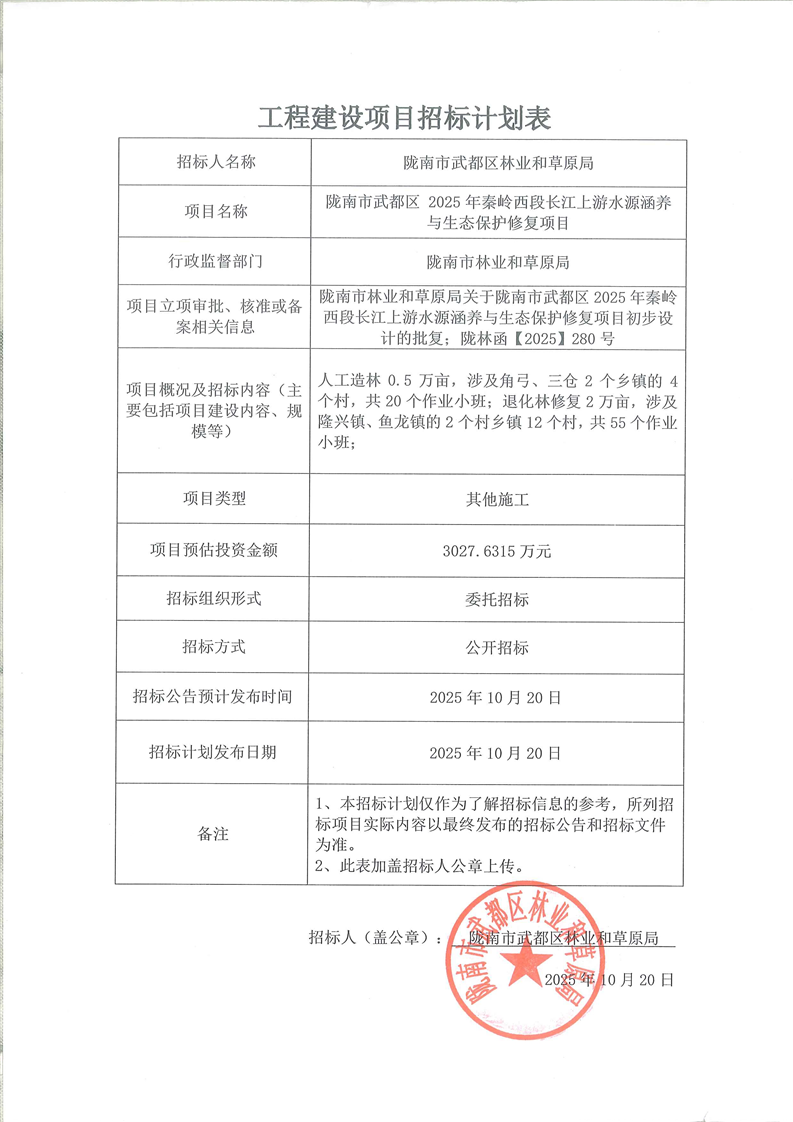 隴南市武都區(qū)2025年秦嶺西段長江上游水源涵養(yǎng)與生態(tài)保護修復(fù)項目