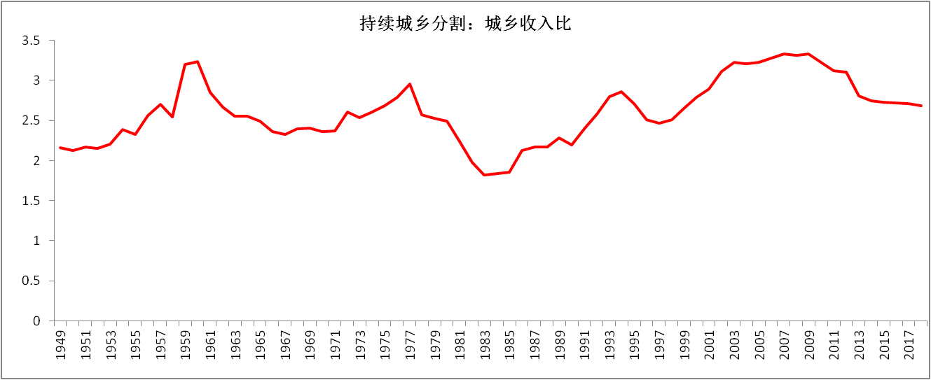 資料來源:其中1949-1956年城鄉(xiāng)居民收入數(shù)據(jù)來自于消費數(shù)據(jù),1957-1977年數(shù)據(jù)來自于《新中國六十年年統(tǒng)計資料匯編》,1978-2018年數(shù)據(jù)來自于《中國統(tǒng)計鑒》。