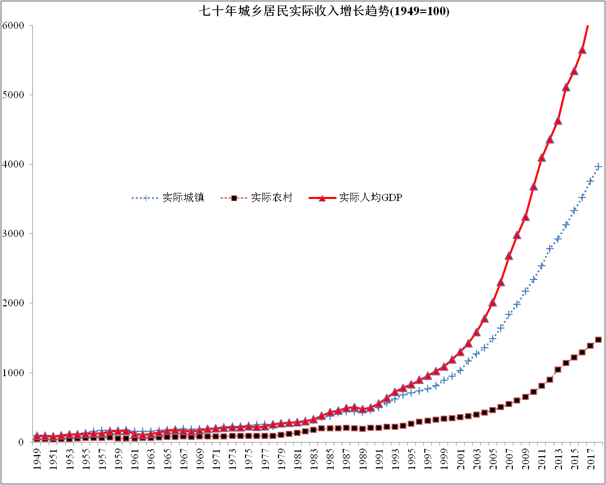 圖5:70年來城鄉(xiāng)居民實際收入增長趨勢