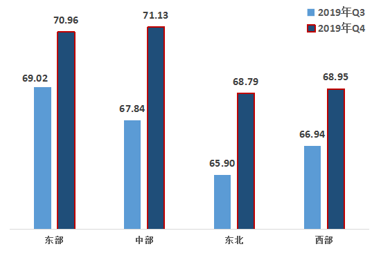 2、從區(qū)域來看,中部地區(qū)崛起,東北地區(qū)與其他地區(qū)的差距呈縮小狀態(tài)。第四季度,東部、中部、東北、西部的改革熱度指數(shù)分別為70.96,71.13,68.79,68.95,比上一季度均有上升。其中,中部、東北地區(qū)的升幅較大。
