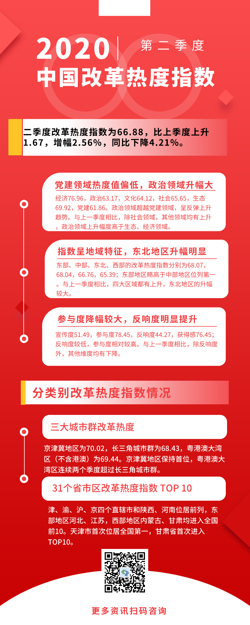 7月21日,中國經(jīng)濟體制改革研究會在京發(fā)布《2020年第二季度改革熱度第三方評估報告》。報告顯示,2020年第二季度改革熱度指數(shù)為66.88,比上季度上升1.67,增幅2.56%。