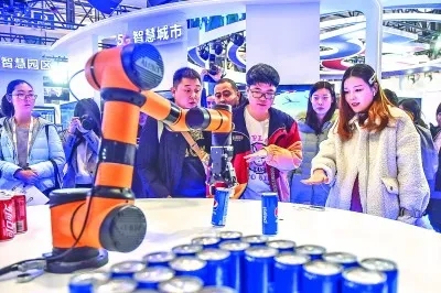 參觀者在北京一場5G大會(huì)上控制機(jī)械臂抓取飲料,體驗(yàn)“隔空取物”