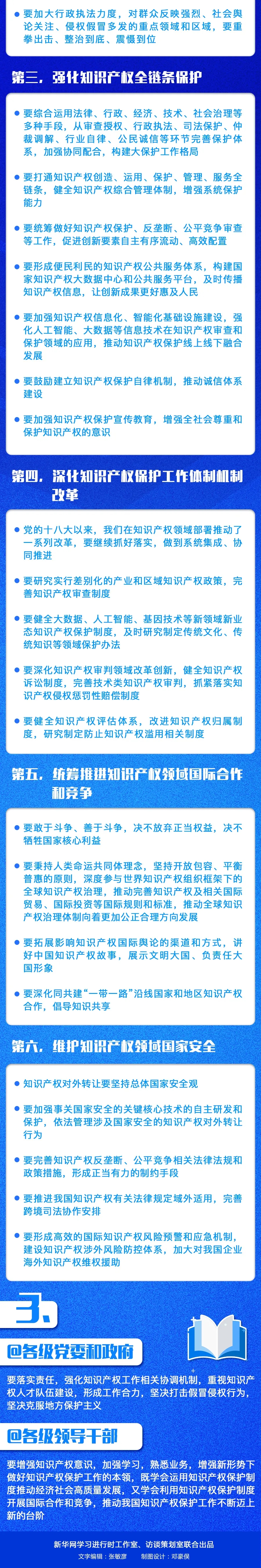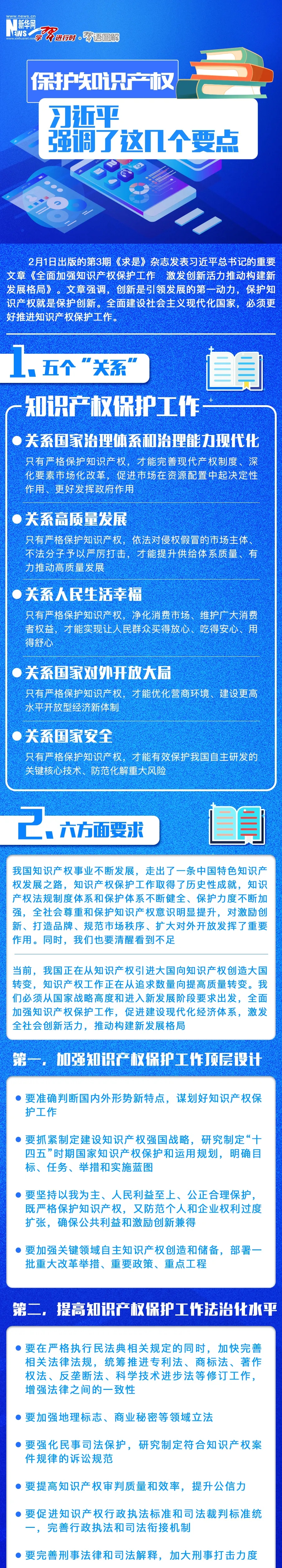 編者按:當(dāng)前,我國(guó)正在從知識(shí)產(chǎn)權(quán)引進(jìn)大國(guó)向知識(shí)產(chǎn)權(quán)創(chuàng)造大國(guó)轉(zhuǎn)變,知識(shí)產(chǎn)權(quán)工作正在從追求數(shù)量向提高質(zhì)量轉(zhuǎn)變。進(jìn)入新發(fā)展階段,如何全面加強(qiáng)知識(shí)產(chǎn)權(quán)保護(hù)工作?第3期《求是》雜志發(fā)表習(xí)近平總書記重要文章《全面加強(qiáng)知識(shí)產(chǎn)權(quán)保護(hù)工作 激發(fā)創(chuàng)新活力推動(dòng)構(gòu)建新發(fā)展格局》。文章從國(guó)家戰(zhàn)略高度和進(jìn)入新發(fā)展階段要求出發(fā),對(duì)全面加強(qiáng)知識(shí)產(chǎn)權(quán)保護(hù)工作提出六點(diǎn)要求,一起來(lái)看。