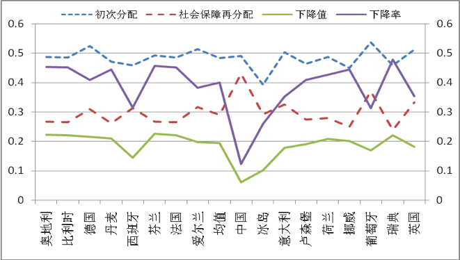 我國社會保障制度在平抑一次分配差距方面還遠沒有發(fā)揮應(yīng)有的作用。據(jù)北師大收入分配研究院2017年的一項研究,18個歐盟國家市場收入的基尼系數(shù)為0.443,在社會保障的作用下,這些國家的可支配收入基尼系數(shù)降為0.29。從下降幅度來看,歐盟國家政府的社會保障政策使得其基尼系數(shù)的平均值下降了40%,相比之下,中國僅下降了12.3%。