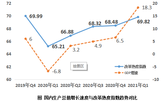4月21日,中國經(jīng)濟(jì)體制改革研究會(huì)在京發(fā)布《2021年第一季度改革熱度第三方評(píng)估報(bào)告》。報(bào)告顯示,2021年第一季度改革熱度指數(shù)為69.82,比上一季度增加1.34,連續(xù)4個(gè)季度保持穩(wěn)定回升態(tài)勢(shì);比去年同期增加4.61,已經(jīng)基本接近疫情前2019年第4季度69.99的水平。