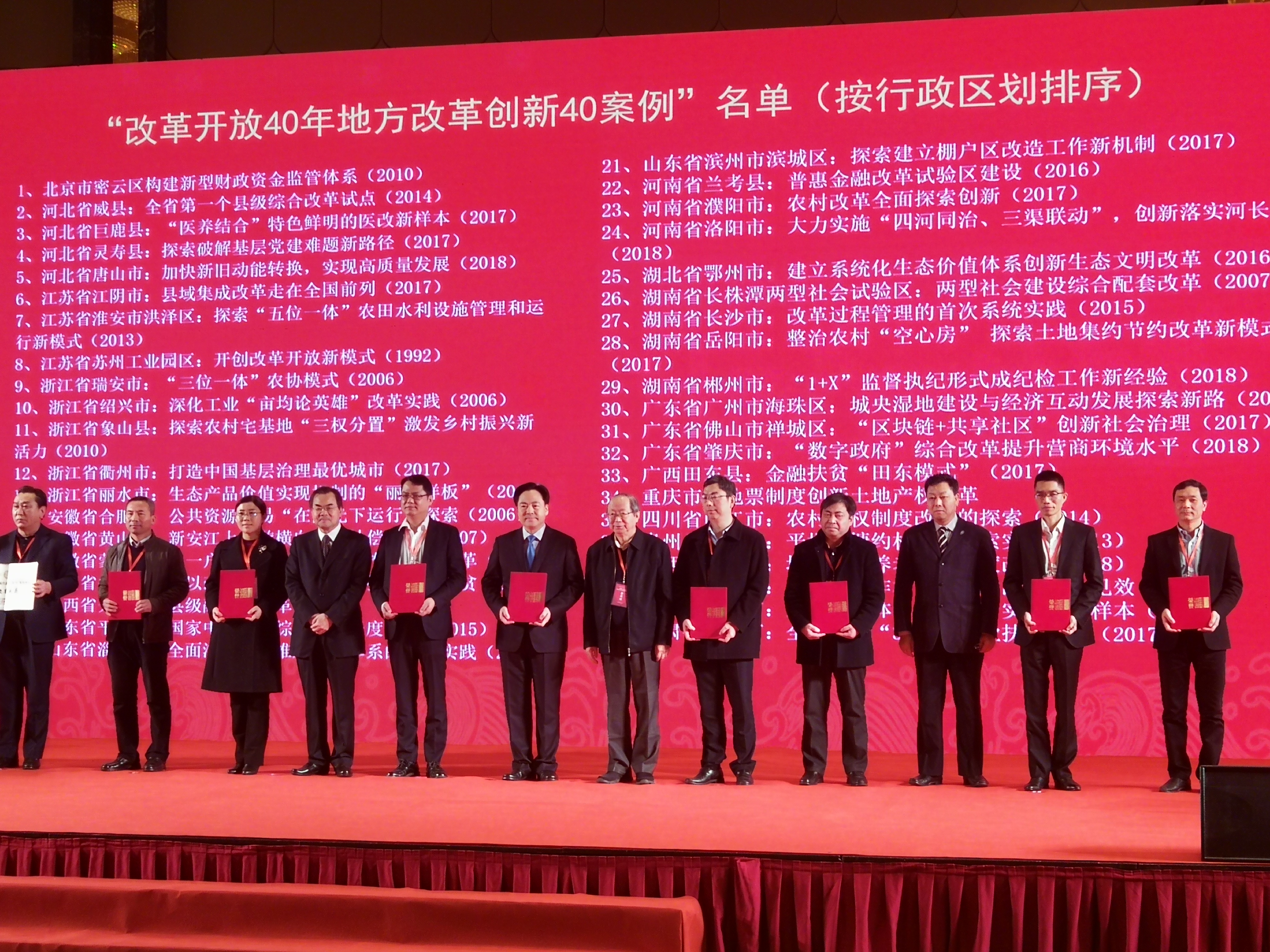 為響應(yīng)中央關(guān)于慶祝改革開放40年號(hào)召,貫徹習(xí)近平總書記在慶祝改革開放40周年大會(huì)重要講話精神,中國經(jīng)濟(jì)體制改革雜志社舉辦的“改革開放40年地方改革創(chuàng)新40案例”(簡稱“40年40案例”)征集活動(dòng)于12月27日在江蘇省江陰市舉辦的“中國改革(2018)年會(huì)”上,揭曉最終名單。180多位來自全國20多個(gè)省區(qū)市的各級(jí)改革部門負(fù)責(zé)人參加了發(fā)布會(huì)議。“改革開放40年地方改革創(chuàng)新致敬案例”名單同時(shí)發(fā)布。