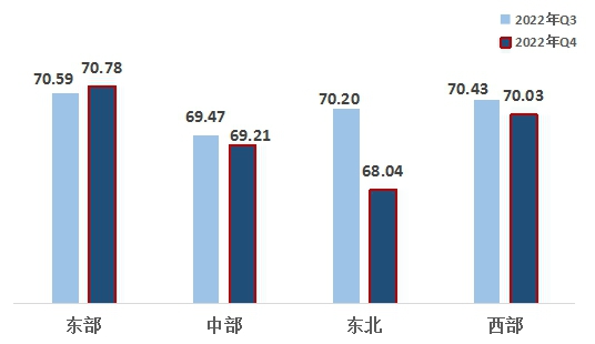 2、西部地區(qū)超越中部、東北地區(qū)。東部、西部、中部、東北地區(qū)指數(shù)分別為70.78、70.03、69.21、68.04。東部地區(qū)領先,西部地區(qū)超越中部地區(qū)排名第二,東北地區(qū)最后。自2022年第一季度以來,西部地區(qū)連續(xù)三個季度超越中部地區(qū)。與上一季度相比,東部地區(qū)有所增長,中部、東北、西部地區(qū)下滑,東北地區(qū)指數(shù)降幅較大。