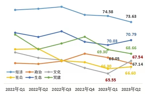 1、從改革熱度指數六大領域來看,政治、經濟領域熱度值降幅略高于其他領域。第二季度,經濟領域73.63,政治領域67.14,文化領域67.54,社會領域66.60,生態(tài)領域70.79,黨建領域68.66。與上一季度相比,文化、社會、生態(tài)領域上升,經濟、政治、黨建領域下降;文化、生態(tài)領域增幅明顯,政治、經濟領域降幅較大。