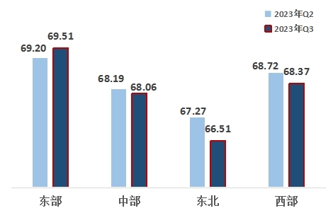 東部、西部、中部、東北地區(qū)指數(shù)分別為69.51、68.37、68.06、66.51。區(qū)域改革熱度指數(shù)呈適當?shù)牡赜蛱卣?,東部地區(qū)領先,西部地區(qū)排名第二,且連續(xù)六個季度超越中部地區(qū),東北地區(qū)最后。與上一季度相比,東部地區(qū)改革熱度指數(shù)有所上升。