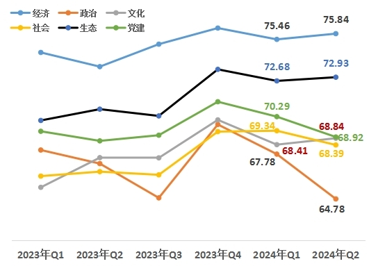 從改革熱度指數(shù)的六大領(lǐng)域來看,經(jīng)濟(jì)領(lǐng)域75.84,政治領(lǐng)域64.78,文化領(lǐng)域68.84,社會領(lǐng)域68.39,生態(tài)領(lǐng)域72.93,黨建領(lǐng)域68.92。與上一季度相比,經(jīng)濟(jì)、文化、生態(tài)領(lǐng)域小幅上升。同比來看,經(jīng)濟(jì)、文化、社會、生態(tài)、黨建領(lǐng)域的改革熱度均呈現(xiàn)上升趨勢。