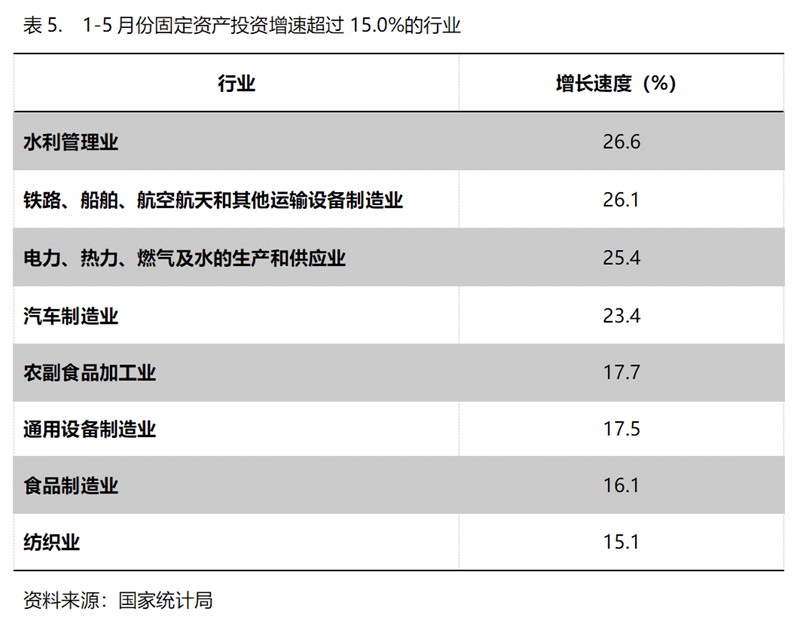 1-5月份,固定資產投資增速超過15%的主要行業(yè)共8個,即水利管理業(yè)增長26.6%,鐵路、船舶、航空航天和其他運輸設備制造業(yè)增長26.1%,電力、熱力、燃氣及水的生產和供應業(yè)增長25.4%,汽車制造業(yè)增長23.4%,農副食品加工業(yè)增長17.7%,通用設備制造業(yè)增長17.5%,食品制造業(yè)增長16.1%,紡織業(yè)增長15.1%。