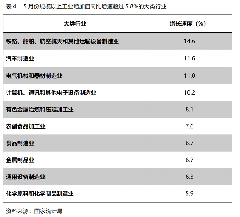 5月份,增長速度超過規(guī)模以上工業(yè)增長5.8%的主要大類行業(yè)共有10個,即鐵路、船舶、航空航天和其他運輸設備制造業(yè)增長14.6%,汽車制造業(yè)增長11.6%,電氣機械和器材制造業(yè)增長11.0%,計算機、通訊和其他電子設備制造業(yè)增長10.2%,有色金屬冶煉和壓延加工業(yè)增長8.1%,農副食品加工業(yè)增長7.6%,食品制造業(yè)增長6.7%,金屬制品業(yè)增長6.7%,通用設備制造業(yè)增長6.3%,化學原料和化學制品制造業(yè)增長5.9%。