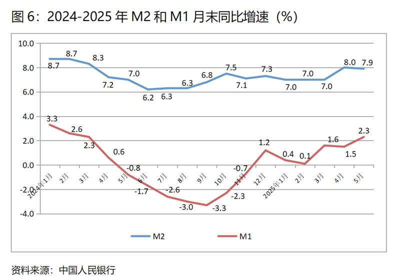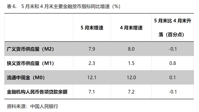 (六)M2增速由升轉落。5月末,廣義貨幣供應量(M2)同比增長7.9%,比4月末增長8.0%回落0.1個百分點,基本保持了上月末的增速;狹義貨幣供應量(M1)增速比上月有所回升,5月末同比增長2.3%,比4月末增長1.5%回升0.8個百分點,而4月末增幅比3月末增幅回落0.1個百分點;流通中貨幣(M0)增速持續(xù)回升,5月末同比增長12.1%,比4月末增長12.0%回升0.1個百分點,而4月末增速比3月末增速回升0.5個百分點。5月末M2增速與上月增速基本持平,M1和M0增速回升,表明貨幣政策仍在向適度寬松方向的要求運行,但需要關注的還是M1增速仍還比較緩慢。