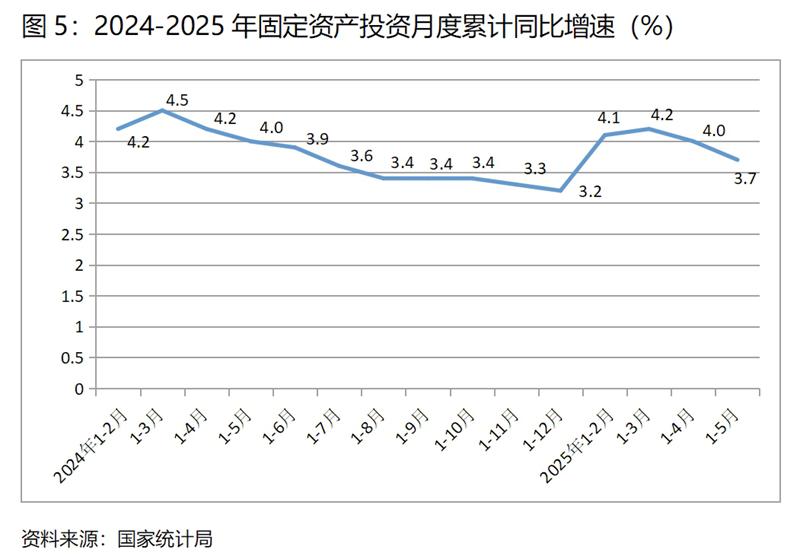(四)工業(yè)增速持續(xù)回落。5月份,規(guī)模以上工業(yè)增加值同比增長5.8%,比上月增長6.1%回落了0.3個百分點,4月份比3月份回落了1.6個百分點,呈現(xiàn)出兩個月的連續(xù)回落。從工業(yè)三大門類看,主要是制造業(yè)增速回落。5月份采礦業(yè)同比增長5.7%,與上月持平;制造業(yè)增長6.2%,比上月回落0.4個百分點;電力、熱力、燃氣及水生產和供應業(yè)增長2.2%,比上月回升0.1個百分點。5月份工業(yè)增速回落幅度雖然比上月收窄不少,但還是要密切關注回落背后反映出的工業(yè)增長動力未來可能變動的趨勢。