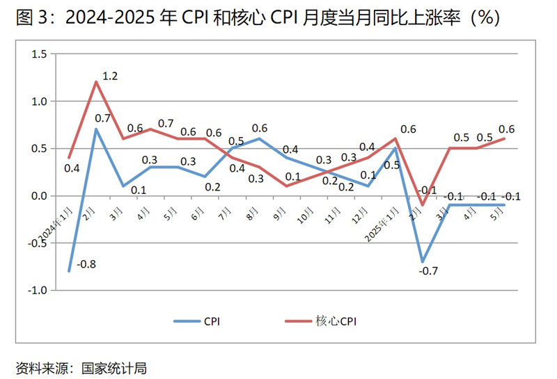 5月份,在CPI 8個類別中有7個類別保持上漲,1個類別下降。上漲的7個類別包括衣著類價格同比上漲1.5%,教育文化和娛樂類上漲0.9%,醫(yī)療保健類上漲0.3%,食品煙酒類上漲0.1%,生活用品及服務類上漲0.1%,居住類上漲0.1%,其他用品和服務類上漲7.3%;下降的雖然就交通通信類1個類別,但降幅較大,5月份同比下降4.3%。