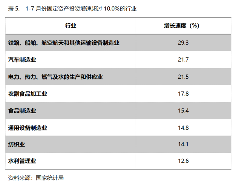 1-7月份,固定資產(chǎn)投資增速超過(guò)10.0%的主要行業(yè)共8個(gè),即鐵路、船舶、航空航天和其他運(yùn)輸設(shè)備制造業(yè)增長(zhǎng)29.3%,汽車制造業(yè)增長(zhǎng)21.7%,電力、熱力、燃?xì)饧八纳a(chǎn)和供應(yīng)業(yè)增長(zhǎng)21.5%,農(nóng)副食品加工業(yè)增長(zhǎng)17.8%,食品制造業(yè)增長(zhǎng)15.4%,通用設(shè)備制造業(yè)增長(zhǎng)14.8%,紡織業(yè)增長(zhǎng)14.1%,水利管理業(yè)增長(zhǎng)12.6%。