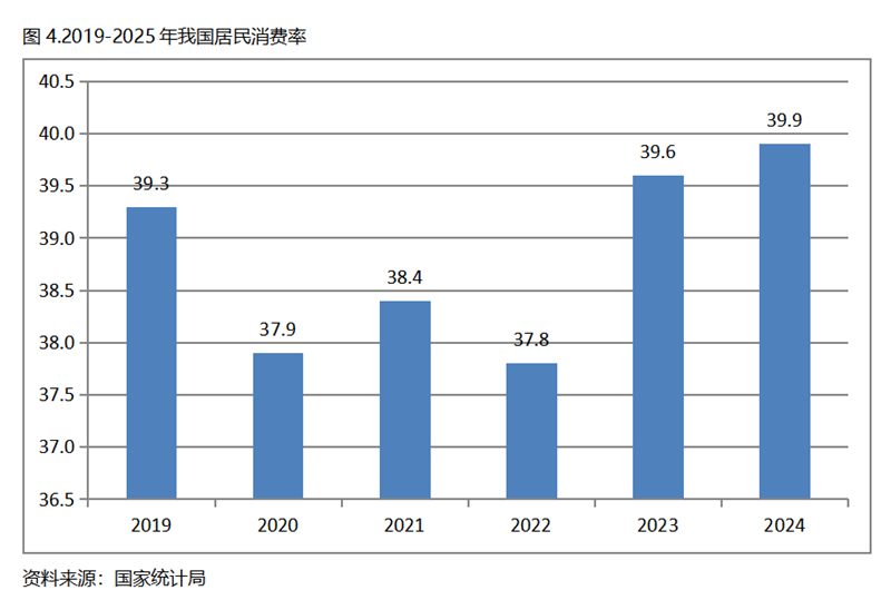 我國是2019年人均GDP超過1萬美元的,在2019-2024年的5年期間,居民消費(fèi)率也呈現(xiàn)先落后升的走勢,總體上看是在低位上保持著穩(wěn)定的態(tài)勢,2024年比2019升0.6個(gè)百分點(diǎn)。需要指出的,我國居民消費(fèi)率在人均GDP超過1萬美元后,雖然也保持總體的穩(wěn)定,但明顯處于較低水平。